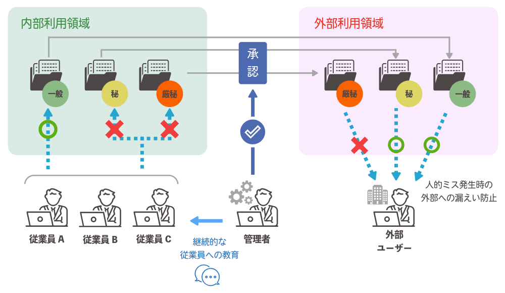 - 外部への持ち出しが可能な領域と一般保存領域を分割し、持ち出し可能な領域を使用する際は管理者の承認を必須とする