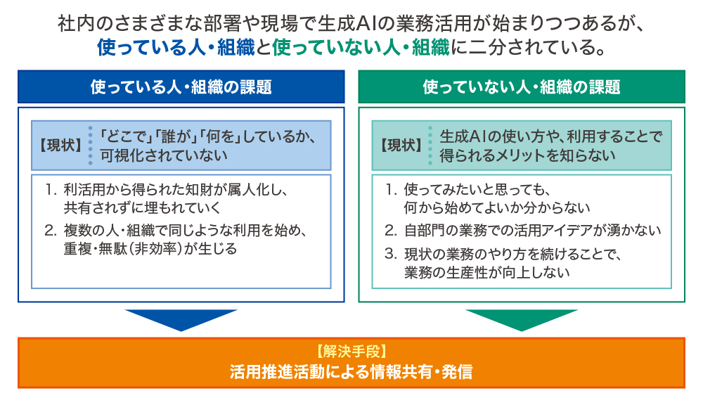 しかし、約3000人いるすべての社員が、必ずしも同じレベルで生成AIを活用できているわけではありません。「使っている人・組織」と「使っていない人・組織」に二分化されているのが実態で、それぞれで課題が顕在化しています。