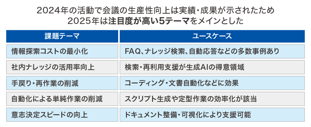 内ヶ島 :2024年度の活動実績を生成AIで分析し、その結果に基づいて決定しました。当初、6つのテーマが抽出されましたが、その中の「会議の生産性向上」については、すでに十分な成果が得られていたため、2025年度のテーマからは除外しました。