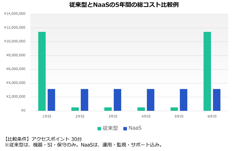 以下は、従来型ネットワークとNaaSを「コスト」「運用」「更新」の観点で比較した一覧です。