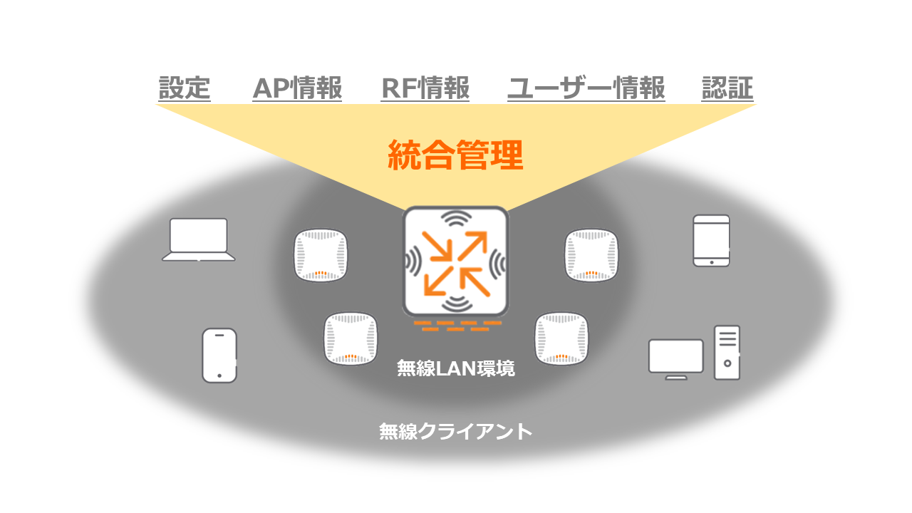 無線LANコントローラーによるAP(アクセスポイント)の統合管理により、設定変更やトラブルシュートの際に運用にかかる時間を削減できます。設定管理の一元化および各種情報を単一のインターフェースから参照することで効率的に優位性を発揮します。