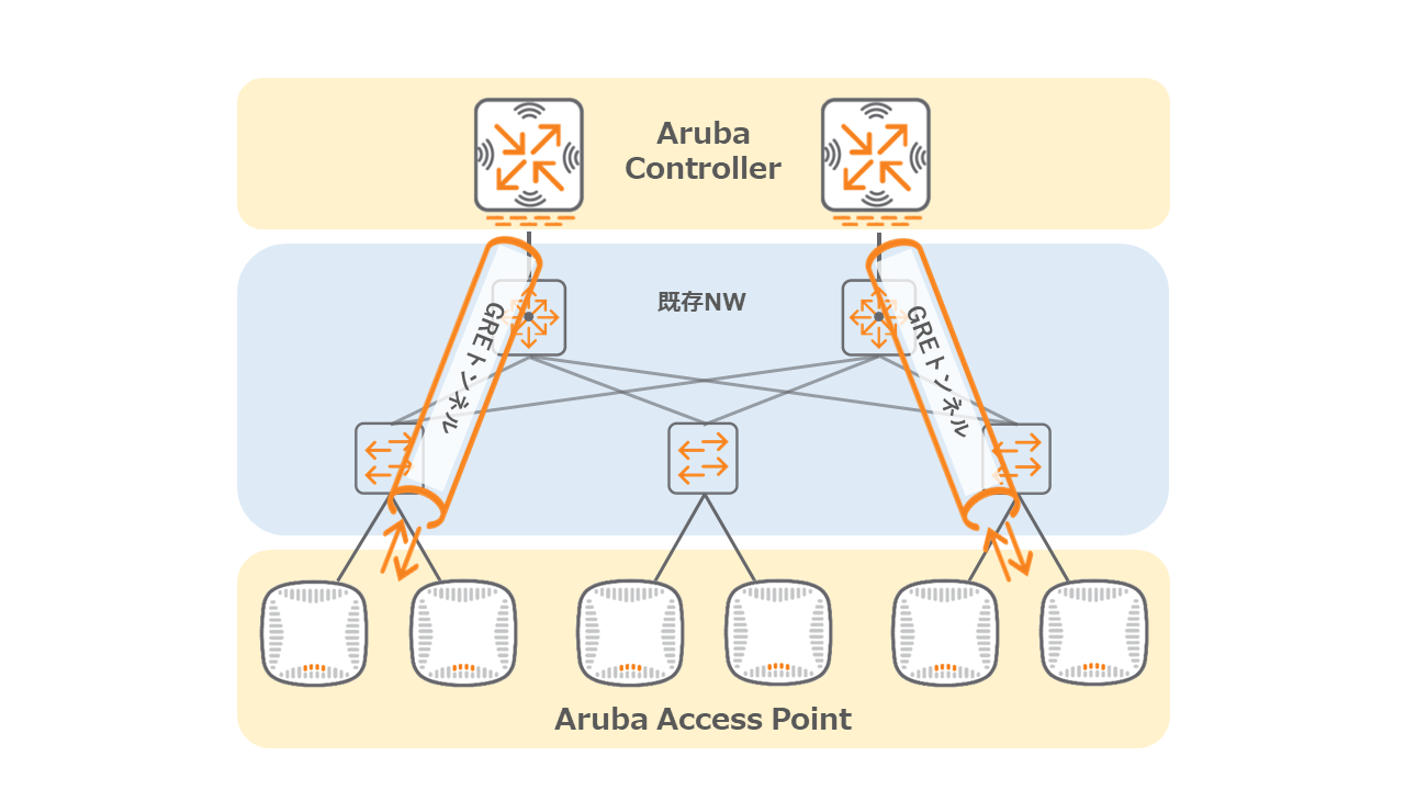 Aruba無線の導入は、既存ネットワークの設定に殆ど影響を与えません。コントローラーとAPがGREトンネルを張り通信を行うことで、中間ネットワークを気にせず、オーバーレイでの導入を可能としています。