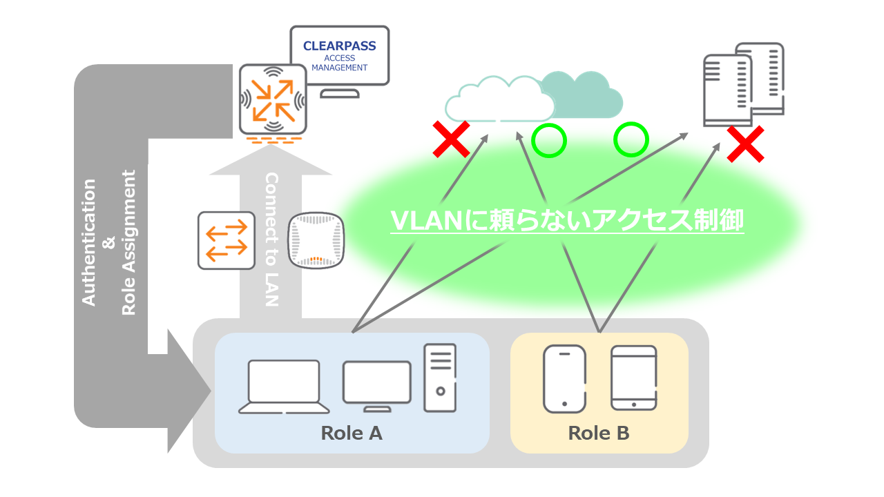 ユーザーロールを用いて、VLANに頼らない柔軟なアクセス制御を行なうことで、きめ細やかなアクセス制御が可能です。Aruba Switchを用いることで、有線端末に対しても、無線端末と同様のポリシーでアクセス制御を行うことが可能です。