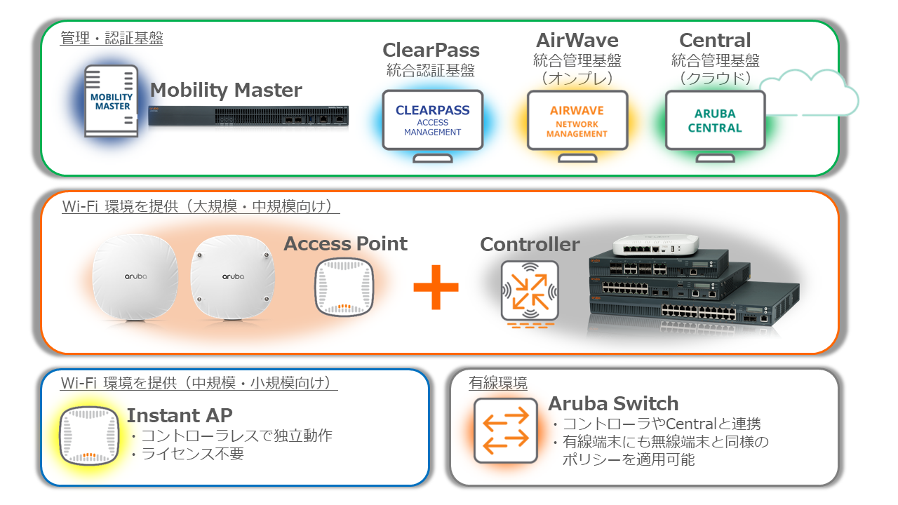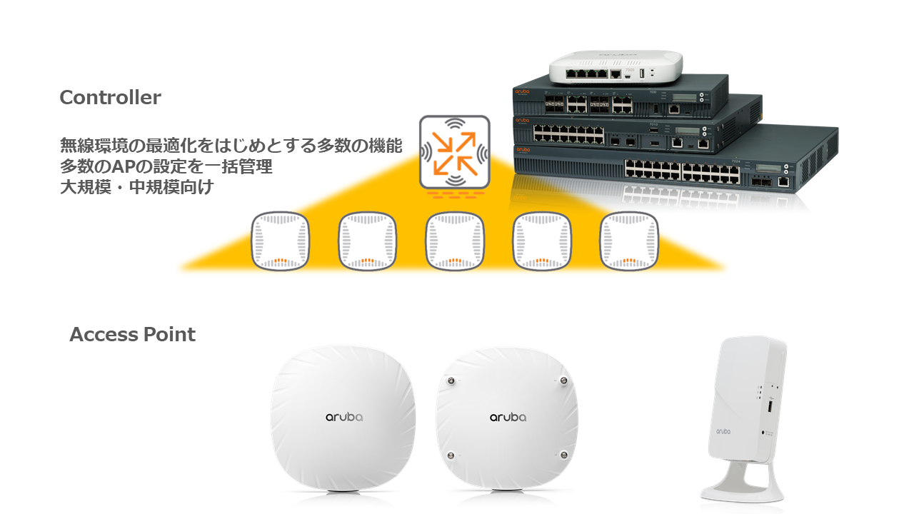- Arubaの無線LANシステムは、先進のワイヤレスシステム、有線/無線を統合した強固なセキュリティーを提供します。無線LANコントローラー、無線アプリケーションソフトウエア、802.11a/b/g/n/ac/ax対応アクセスポイントおよびRFモニター機能で構成されています。