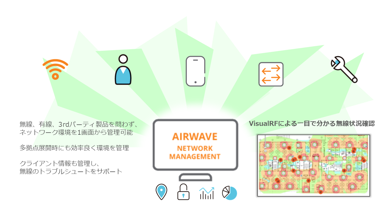 無線環境を中心とした統合管理基盤です。Visual RFでの電波状況を可視化をはじめ、機器ステータスの確認、クライアントの状態監視等多数の管理機能を有し、トラブルシュートにも役立ちます。Instant APの設定管理機能も有しており、多数の拠点を持つお客様でも1画面から全ての拠点を管理することが可能です。