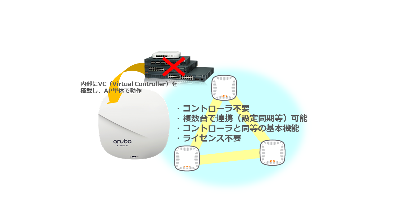 無線LANコントローラー機能の一部を内蔵した自律型のアクセスポイントです。リーズナブルにコントローラーとほぼ同等な基本機能を利用可能となっており、複数での連携、設定の共有等、中小規模の環境においてパフォーマンスを発揮します。また、小(中)規模の拠点が多数存在するような環境では、AirWaveやCentralと連携することで、1画面から全拠点の管理も可能となります。