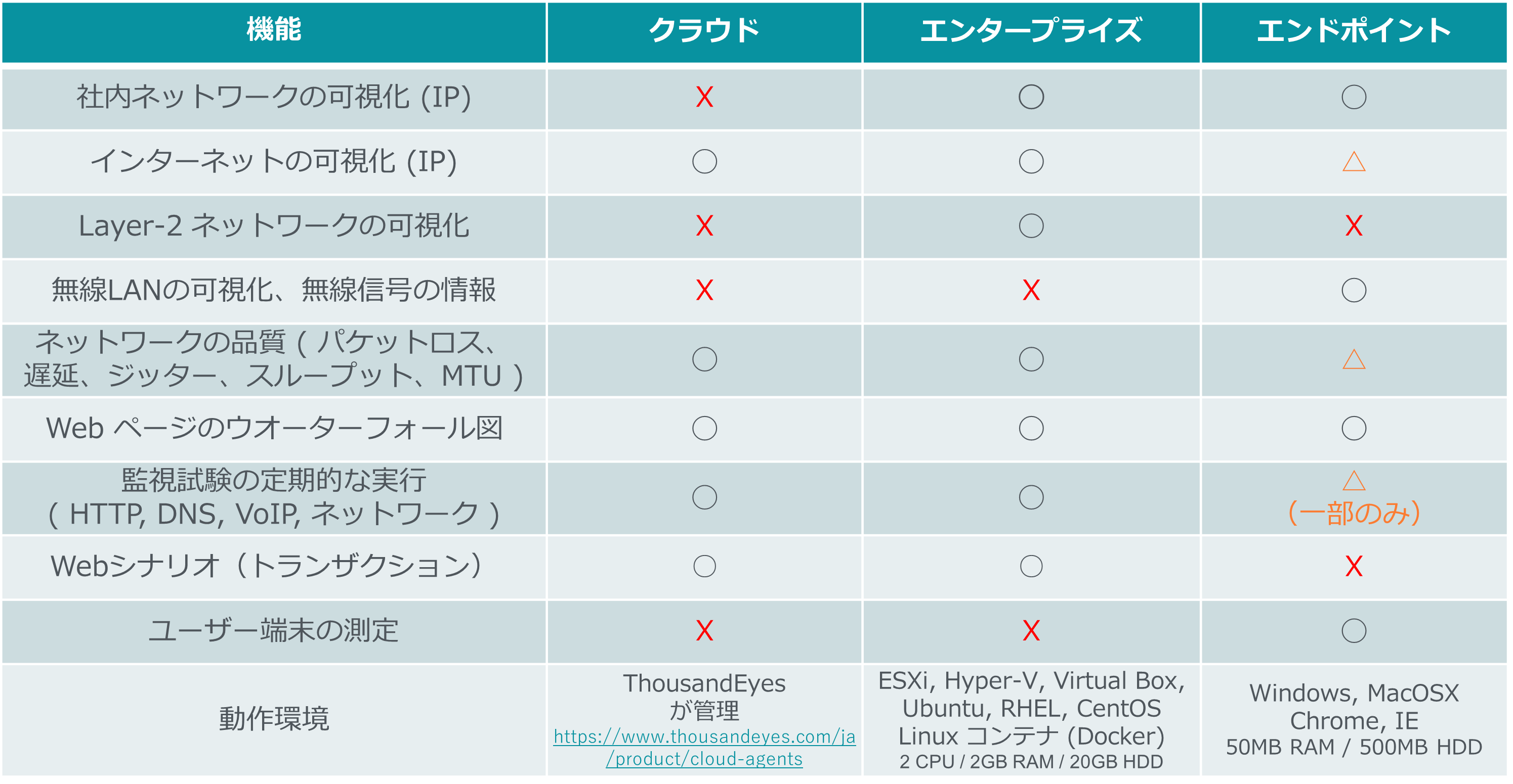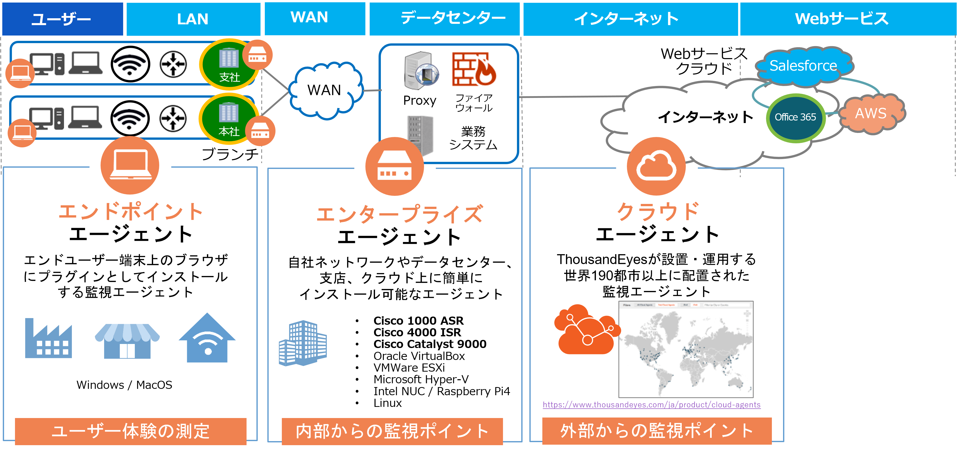 Cisco ThousandEyesには3タイプのエージェントが用意されています。