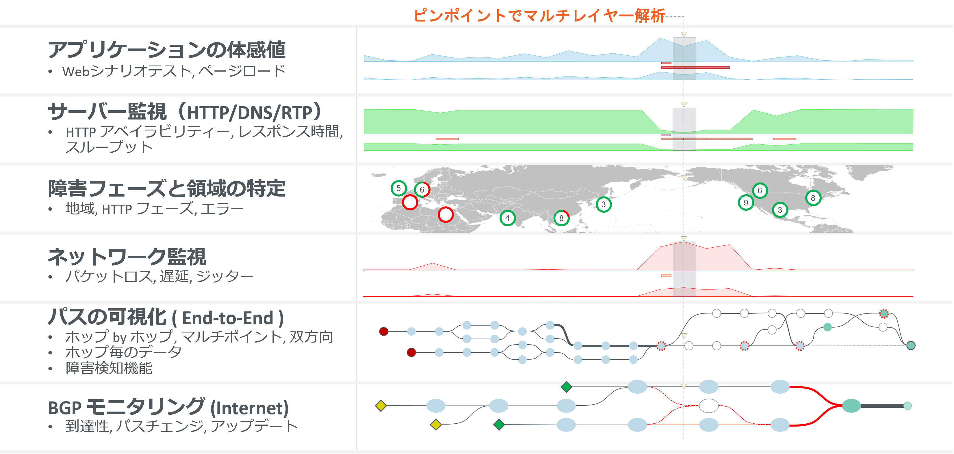 Cisco ThousandEyesではさまざまなネットワーク状態を、同時にマルチレイヤー解析で可視化することができます。