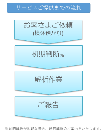 お預かりしたデータに対し、マルウエアの可能性を調査ご報告するサービスです。