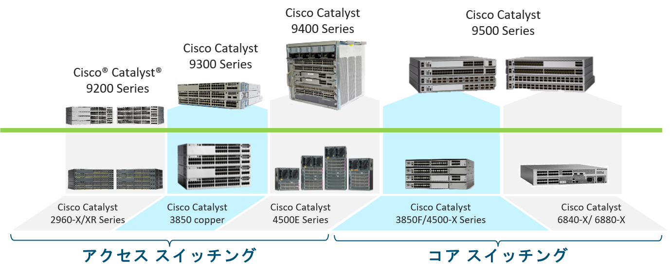 9000 シリーズ製品ラインアップはアクセススイッチングモデルの Cisco Catalyst 9200 シリーズ、Cisco Catalyst 9300 シリーズ、Cisco Catalyst 9400 シリーズ、および コアスイッチングモデルのCisco Catalyst 9500 シリーズで構成されます。