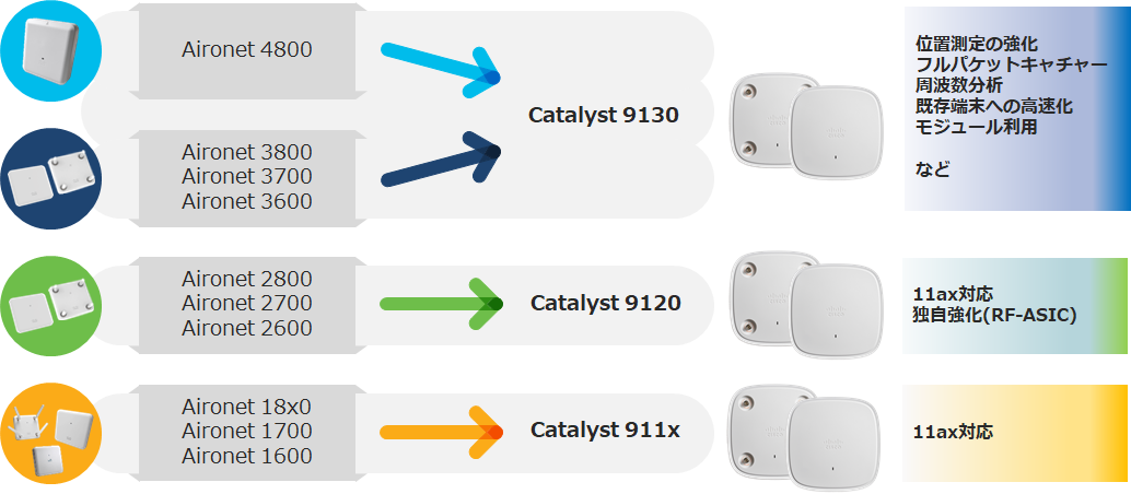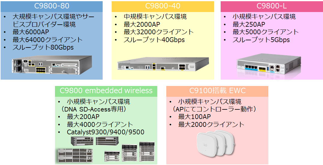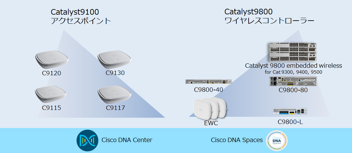 ラインアップは、ワイヤレス LAN コントローラーの Cisco Catalyst 9800 シリーズ、ワイヤレス アクセスポイントのCisco Catalyst 9100シリーズで構成されます。