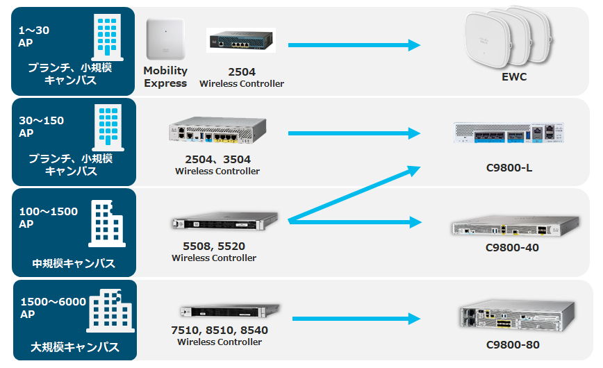 Catalyst 9800 シリーズのワイヤレスコントローラーおよびCatalyst9100シリーズのワイヤレスアクセスポイントは、お客さまの規模や用途に合わせ最適なラインアップを用意しています。小規模/中規模/大規模などの規模に相当するものや、ミッションクリティカルやベストインクラスなど導入環境のニーズに合った無線ネットワークの環境を構築することが可能です。