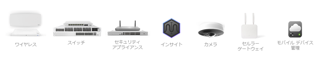■ MRシリーズ(無線LANアクセスポイント)■ MSシリーズ(L2/L3スイッチ)■ MXシリーズ(ルーター&ファイアウオール)■MVシリーズ(監視カメラ)■ MIシリーズ(クラウドアプリケーション監視)■ SMシリーズ(MDM(モバイルデバイスマネージメント)) ■MGシリーズ(Celler Gateway)