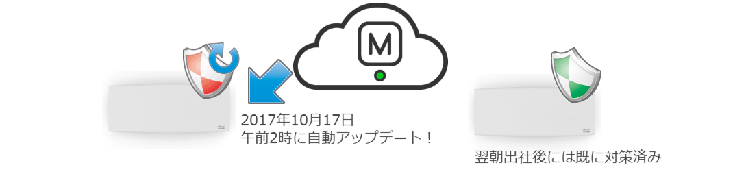 追加費用なしで自動アップデート可能!Merakiクラウドから早期に修正パッチがリリースされ、アップデート可能!