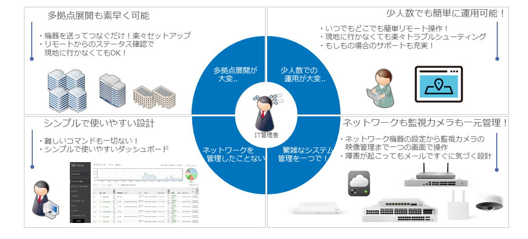 一般企業、文教、小売、流通など、多種業態での多数の導入実績Merakiの資格を持つSEが全国に多数在籍しており、導入・運用をサポート複数拠点にまたがる導入も、全国を対象とする広い保守範囲でカバー