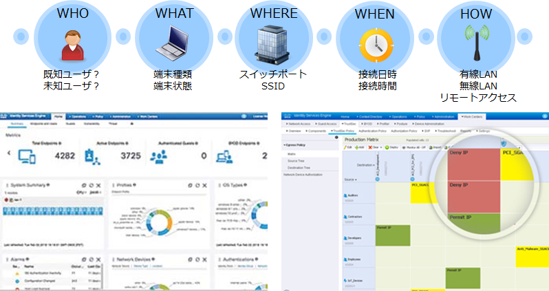 ユーザー認証やデバイスプロファイリングなど柔軟な認証が可能であり、ゲスト認証などもGUIで簡単に設定が出来ます。Cisco製品と連携することで更に多彩な認証・アクセス制御・セキュリティー機能の使用が可能です。例えば、社内ネットワークにログインする全てのデバイスをプロファイリングし、ユーザーの所有するデバイス毎に細かなポリシー制御が可能なため、BYOD (Bring Your Own Device)をはじめとするマルチデバイス環境における、セキュリティーコントロールも可能となります。