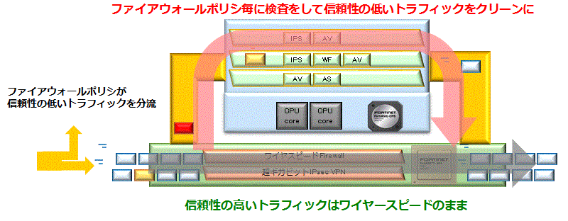 FortiGateは「FortiASIC」という独自開発の専用プロセッサが搭載されています。「FortiASIC ネットワークプロセッサー」では、ファイアーウォール、VPN、IPSなどネットワークレベルの防御機能を処理。「FortiASIC コンテンツプロセッサー」では、ウイルス対策やWebフィルタリングといったコンテンツレベルでの防御機能を担います。機能ごとに処理を任せることで、パフォーマンス低下の問題がほとんど起きません。