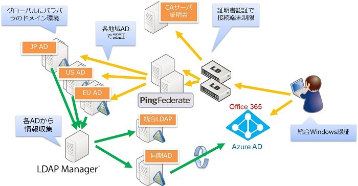 Office 365を利用するためにはAzure ADの構築が必要となります。Azure AD Connectorを利用することで簡単に既存のAD情報をAzure ADに同期することができます。パスワードも同期することができますので社内のADもしくはネットワークがシステムダウンしても認証することができます。しかし、クラウド上にパスワードを置くことはまだ敬遠される傾向にあります。ADがひとつ(正確にはフォレストがひとつ)であれば、それほど難しいことではないので、すぐにでもAzure AD Connectorを導入できます。しかし、海外等の各地に点在するADに対してAzure AD Connectorを利用する場合、注意が必要です。Azure AD Connectorはマルチフォレストに対応しておりWANでつながる範囲であれば各地のADから情報を吸い上げてAzure ADに書き込むことが可能です。しかし、グローバルに点在するADはユーザー名の付与の方法が各地域に依存されているケースが多く、ユーザー名が重複しコンフリクトを起こす可能性があります。このような課題をコントロールして意図した情報をAzure ADに同期させる必要があります。