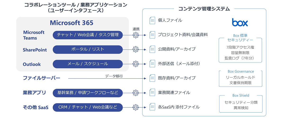そこで推奨するのが、Microsoft 365とコンテンツ管理システムBoxの組み合わせです。Microsoft 365の多様なコミュニケーションツールをインターフェースとして利用しつつ、コンテンツは全てBoxで管理することにより、ファイル共有の利便性とセキュリティーの向上が期待できます。