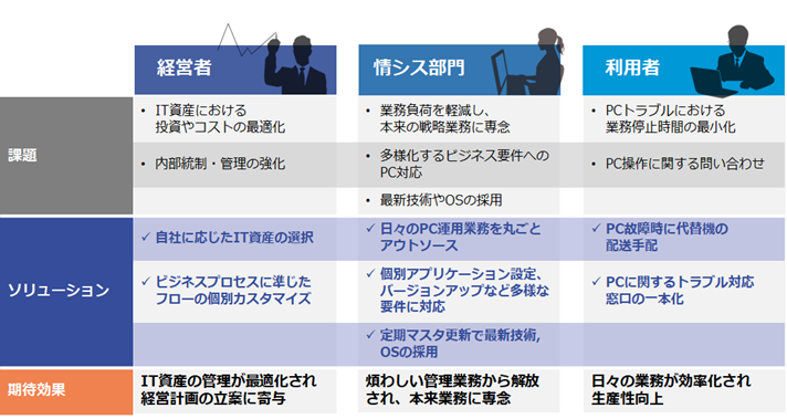 各種クライアント端末の運用管理のすべてをアウトソーシングにてユニアデックスへお任せいただけるサービスです。クライアント端末の運用管理に関するコストと品質の課題を解決できます。お客さまはビジネスの成長を目指し、コア業務に専念できます。