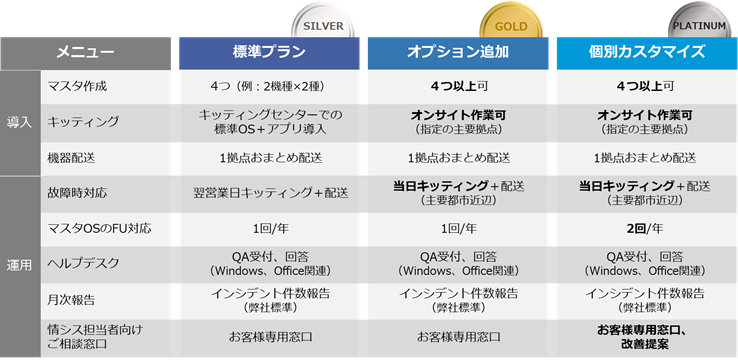 標準的に必要なメニューをシルバープランとし、サービスのクイックスタートを可能としています。また、ゴールドプランでのオプション提供、お客さま個別要件カスタマイズのプラチナプランのラインアップをご用意しております。