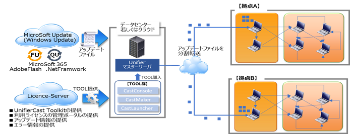 WindowsがWindows As a Serviceとなり、利用しているOSのサポート期間に加え、更新プログラムのサポート期間を意識する必要があります。更新プログラムのサポート期間はOSのサポート期間よりも短く、定期的なアップデート作業が必要となり、アプリケーションの動作確認やマスターOSの再作成で運用工数が増大するという課題があります。そこで「小中規模向けセキュリティーパッチ配信サービス」を利用することで適切な配信と管理が可能となり、お客さまの運用負荷軽減を実現します。また容量が大きいFeature Update配信時のネットワーク負荷を軽減する機能も搭載しネットワーク帯域を圧迫することなく、機能更新プログラム(FU)と品質更新プログラム(QU)及びO365更新プログラムを配信を行います。