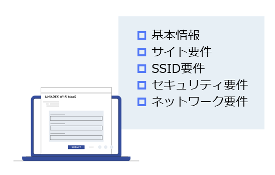 ヒアリングシートで要件確認し、多数の導入実績に基づく標準設計パターンへ落とし込み。机上シミュレーションでAP配置設計。お客さまは事前設定済みのAPを設置するだけでWi-Fi利用開始 - 運用・保守も全て対応