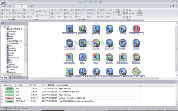 マップ画面へ監視対象機器を登録し、稼働状況の管理を行います。監視対象機器を正確に把握するためハードウエア資産情報を管理します。