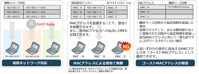 PCなど端末のMACアドレスを登録し、登録された端末のみIPアドレスを払い出すことができます。正規に登録されていない端末のネットワークへの接続を防ぐことができます。