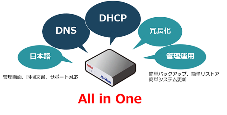 NetAttest D3 (ネットアテスト・ディー・スリー)は、DHCPとDNSサービスを提供することに特化した専用アプライアンスです。信頼性を重視したハードウエアと、運用性を徹底追求したソフトウエアNAOS(ネイオス)を採用しネットワーク・コアサービスの、安定かつ効率的な運用を強力にサポートします。