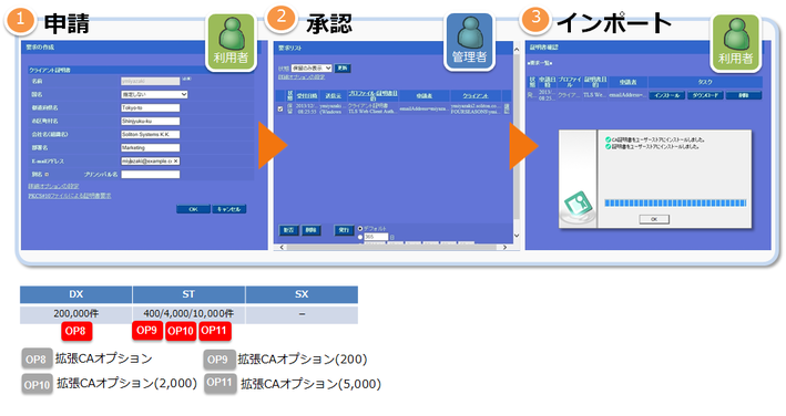 - 申請・承認ワークフローにより、ネットワークを介して、安全かつ確実な電子証明書の配布に対応できます。