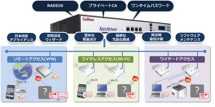 NetAttest EPS(ネットアテスト・イー・ピー・エス)ではLANへの接続時にユーザーや端末を特定する認証サーバーとしてIEEE802.1Xなどネットワーク認証に必要な機能をオールインワンで備え、正しい端末・正しいユーザーのみネットワークに接続できる安全な環境を実現します。