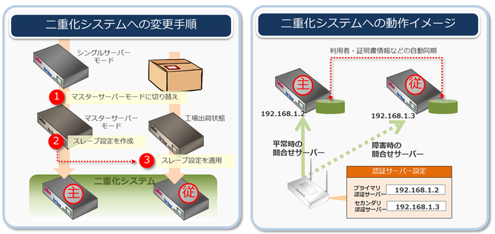 - NetAttest EPSでは、『1:N』の冗長化に対応しています。