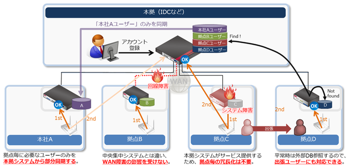 - 各拠点に認証サーバーを配置することで、WAN回線の障害にも強いシステムになります。