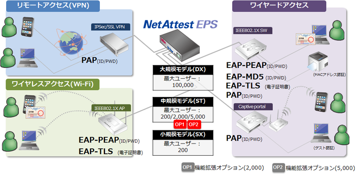 - NetAttest EPSはID/PASSWORD認証から電子証明書認証まで、さまざまな認証方式に対応します。