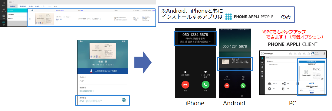 「PHONE APPLI PEOPLE」は、PCブラウザー、スマートフォンアプリ(iPhone/Android)から利用できます。