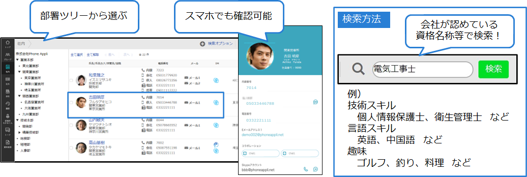 - 部署、キーワードから社員やお客さまを検索し連絡可能