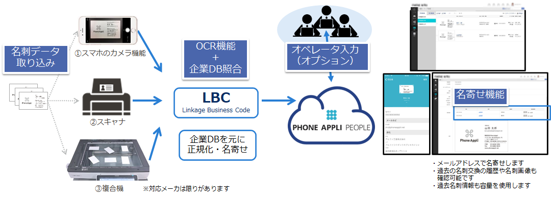 - スマートフォンやスキャナー、複合機を利用して簡単に名刺情報を登録可能
