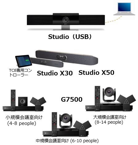 Poly ビデオ会議は本体とカメラを柔軟に組わせ可能な G7500 シリーズや 、Group シリーズを中核として、さまざまな規模や用途へ柔軟に構成できます。