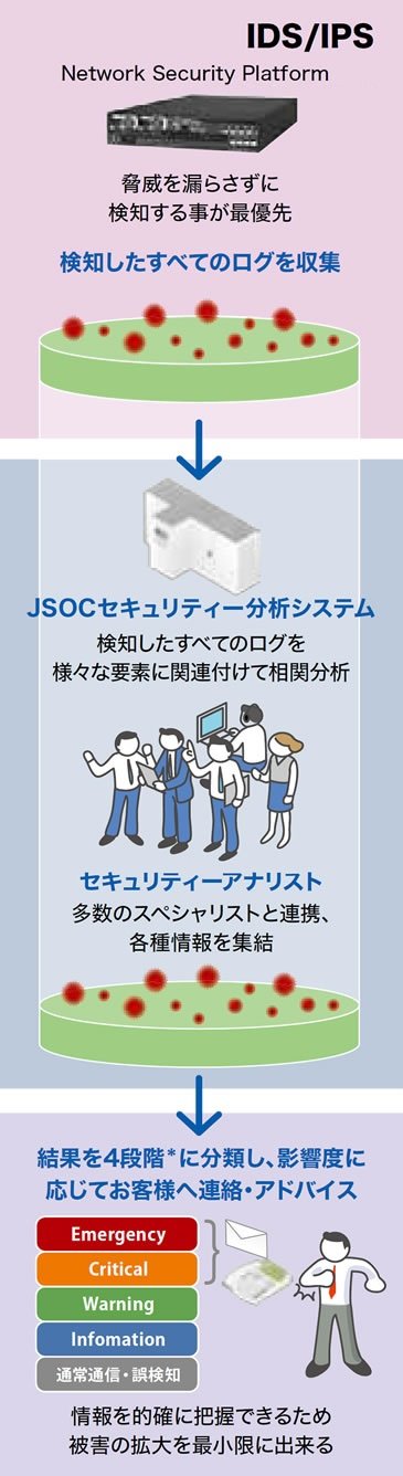検知力が違います一般的な監視サービスでは、機器の運用効率を上げるためにログ量を減らすためのチューニングを行いますが、当社サービスではすべてのログを取り込み、危険のわずかな兆候も見逃しません。メーカー標準のシグネチャーが未対応で検知できない新たな脅威には、JSOCが独自に開発したシグネチャー(JSIG)で対応。これにより、Trellix Network Security Platform(NSP)などのIDS/IPSをより強力に運用可能となり、更なる検知率の向上を実現し、新たな脅威にもいち早く対応できます。分析力が違いますJSOCセキュリティー分析システムが、監視対象となるセキュリティー機器の全ログを集約し、グローバルレベルの攻撃動向や不正IPの履歴などさまざまな要素をもとに相関分析を行います。さらに、経験豊富なセキュリティーアナリストが詳細な分析を行い、危険性の有無を判断します。対応力が違いますセキュリティーアナリストが、ログの分析結果から攻撃の影響度を判定し、本当に問題があるイベントのみをお客様に連絡します。誤検知を含む大量のログからお客様自身が分析・判定する必要はありません。重大インシデントと判断された場合は、セキュリティーアナリストが即座に電話でご連絡します。単なる攻撃情報だけではなく、攻撃による影響範囲や必要な対応策など、具体的な内容までをお伝えします。