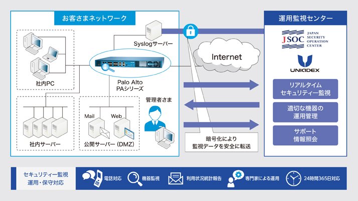 本サービスは、お客さま環境へ設置した対象機器のログを監視し、不正なアクセスを検知・遮断するサービスです。Palo Alto Networks PAシリーズのシグネチャー更新、巧妙化する不正アクセス通信の分析、不正侵入検知後の対策方法のご案内を、JSOC(※)が24時間365日リアルタイムで能動的に実施し、万が一の機器障害時はユニアデックスがお客さまに代わり切り分けや障害マネジメントを実施します。