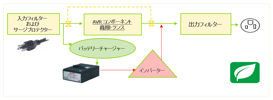 入力電圧が変動した場合、自動電圧調整回路、AVRコンポーネントを使用して、入力電圧を補正し、安定した電気を出力します。しかし、入力の電源状態が良い時は、入力の電圧を補正する必要はありませんので、黄色の点線のように、その回路を迂回することで、そこで消費される電力を抑えることができます。