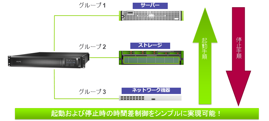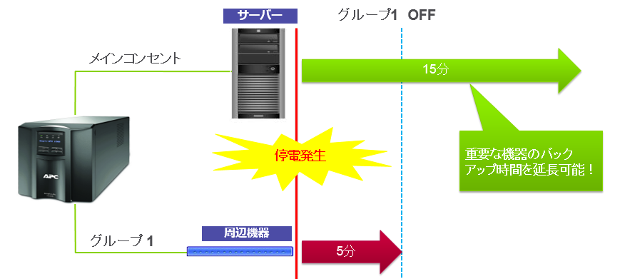 停電が発生してから一定の時間が経過したのち、周辺機器のグループ1をオフすることによって、 サーバなどの重要な機器のバックアップ時間を延長することができます。