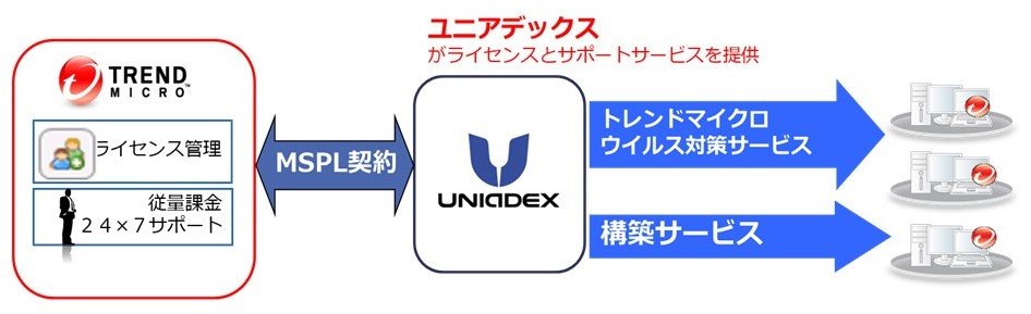 トレンドマイクロウイルス対策サービス(以下、ウイルス対策サービス)は、製品の使用権(ライセンス)とサポートをあわせてご提供する、ユニアデックスのサービスです。ユニアデックスが導入構築からサポートサービスまでをワンストップで実施いたします。
