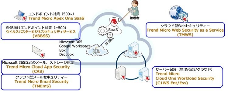 トレンドマイクロSaaS製品のライセンスとそのサポートサービスをあわせてご提供します。以下の5種類のサービスをご用意しています。(1) ウイルスバスタービジネスセキュリティサービス (2) Web Securityサービス(3) Email Securityサービス(4) Cloud App Securityサービス(5) Cloud One Workload Securityサービスウイルス対策サービスのサービス概要と対応するトレンドマイクロSaaS製品は、以下のとおりです。