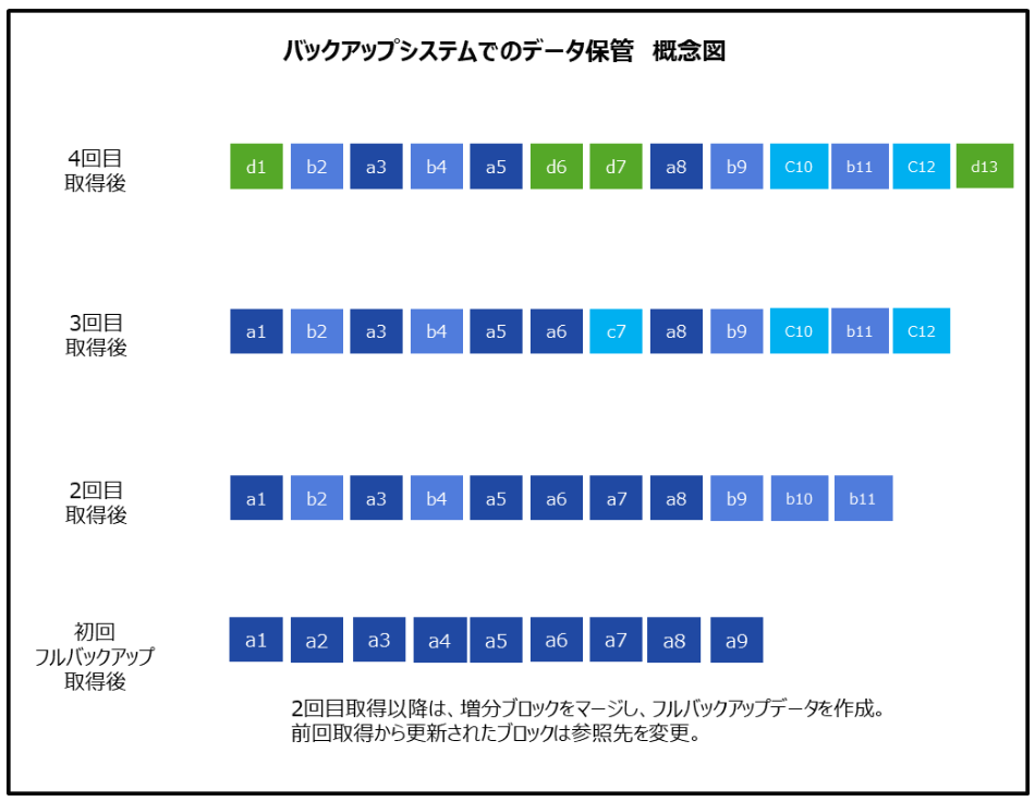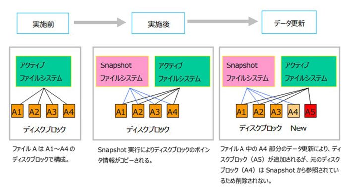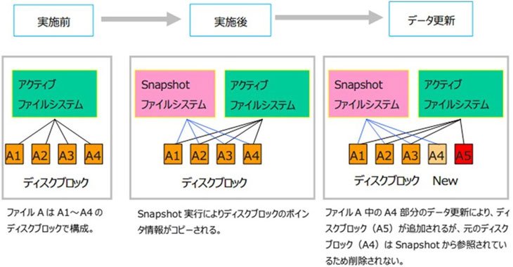 データ領域と同一ボリュームの世代管理領域にファイルの差分情報を保持しますので、重要なデータについては、世代管理だけでなく、別ボリュームへのデータ複製ないし別ストレージ筐体へのバックアップをお勧めします。
