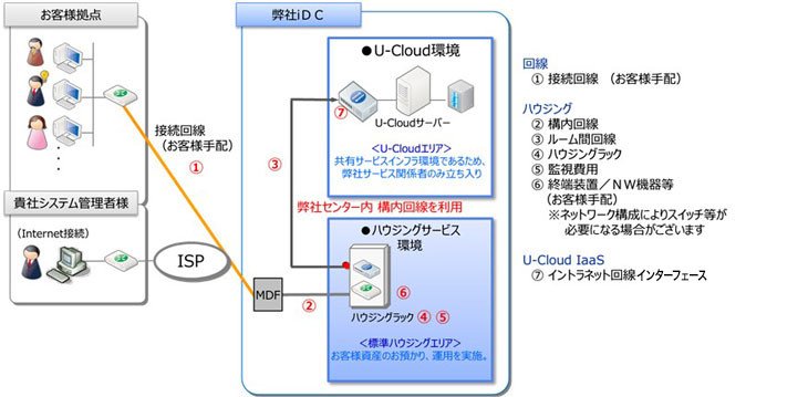 ハウジングエリアをご契約いただき、イントラネット回線インターフェースでU-Cloud IaaS環境に接続することで、個別機器がご利用いただけます。