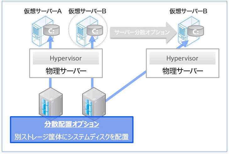 また、冗長化した仮想サーバーが異なる物理サーバーに配置されることを保証するサーバー分散オプションや、物理サーバー障害時に自動的に別物理サーバーで再起動するHAオプションをご利用いただくことで、可用性の高いシステムを構築することができます。