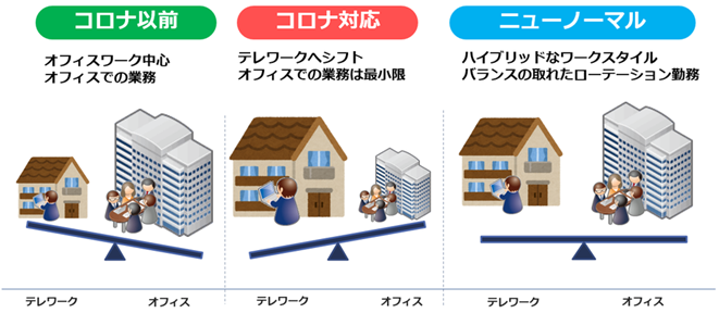 新型コロナウイルスの感染拡大に伴ったテレワークの急激な普及や出社率制限の導入で、「働き方」にも大きな変化が生じました。あまりにも急激な変化だったため、暫定や急造で準備した現在のテレワーク環境への不満やセキュリティー面での不安を抱いているお客さまも多く見受けられます。一方で、新型コロナウイルスに対する考え方の変化や各種規制の緩和で「働き方」の変化は次のステージに突入しつつあります。社会環境の変化とともに企業は「働き方」に対するより柔軟な対応を求められるようになっています。